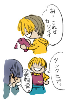 この絵は借り物です。 描いてくださったのは、みとさまです。 内輪ウケっぽいですが、絵がかわいいので、むりやり拝借してUPさせていただきました。 レジ袋を模した布袋って、裾を切ったらタンクトップみたいですよね……っていうお話。