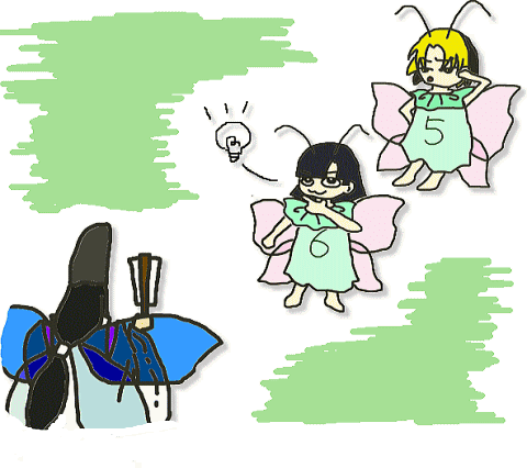 | ふたりは、昆虫王のお城へとやって来ました。 「待っていましたよ、ヒカル、アキラ」 お城の中庭でふたりを出迎えてくれたのは、他でもない昆虫王の佐為でした。 昆虫の世界の王様だけあって、佐為は、他の虫にはない美しい青い翅をもったセミです。 「こんにちは、王様。お元気そうでなによりです」 「なんだよ、王様。せっかく中盤に入って、おもしろくなってきたトコだったのに」 アキラは、お行儀よく挨拶をしましたが、ヒカルは、ちょっと不機嫌そうです。 「おやおや、碁を打っていたのですか。それは悪いことをしましたね」 佐為は、申し訳なさそうな顔をしました。 あまり威張った王様ではないようです。 「で? オレたちにいったい、なんの用だよ」 ヒカルは、「さっさと帰って続きを打ちたいんだよ」と、話を促しました。 「実はですね。伝説の秘宝が、実在しているかもしれないという情報が入ったのです」 佐為は、手にしていた扇子をひらいて口元にあて、内緒話をするように小声で言いました。 「伝説の秘宝というと……あの『イロモノ傳』に書かれているアレですか?」 アキラは、驚いたように尋ねました。 「ええ、その通りです。そこで、ふたりに、その秘宝を見つけて持ってきてほしいのです」 「伝説の秘宝とか、イロモノとか……。なんのことだ?」 きょとんとしているヒカルに、アキラと佐為が説明してくれました。 「古くから昆虫界に伝わる伝説だよ。その宝を手にした者は、幸せになれると言われているんだ」 「なんでも願いを叶えてくれるとも言われています。そんな物が、心ない誰かの手に渡ってしまったらたいへんです。一刻も早く見つけ出して、お城の奥にしまっておかなくては」 「ふーん。うさんくせえ話だな」 ヒカルは、興味なさそうです。 「でも、『イロモノ傳』によると、カブトムシさんやクワガタさんが立派なツノを持つようになったのは、その秘宝を手にしたからだそうだよ」 「だからって、別にオレ、ツノなんかいらないし。おまえは欲しいのか?」 「いや、ボクもいらないよ」 「だったら帰ろうぜ。そんなマユツバもんの話、あてになんねえし」 「そうだね」 ヒカルとアキラは、「じゃ、そういうことで」と、うしろを向きました。 「そんなあ……」 佐為は、王様の威厳もなにもあったものではなく、シュンとしてしまいました。 メソメソと泣き出してしまった佐為を振り返ることなく、ヒカルとアキラは、さっさと歩いていきます。 ところが。 佐為は、なにかいいことを思いついたらしく、がばっと顔をあげました。 「伝説の秘宝を探し出してくれたら、ご褒美をあげましょう」 「「ご褒美?」」 現金なもので、ふたりはその言葉に、ぴたっと足をとめました。 「あなたたちは、もともと人間だったのでしょう? もう一度、人間として生きてみたいとは思いませんか? わたしなら、伝説の秘宝の力を借りて、ふたりを人間にしてあげることができますよ」 「人間ねえ…………別にいいや。オレ、今の生活に満足してるし」 ヒカルは、そう言いますが、アキラは違うようです。 「人間か……」 顎に手をあてて考え込んでいたかと思うと、なにやらひらめいたような顔をしました。 いったい、なにをひらめいたというんでしょうか。 |